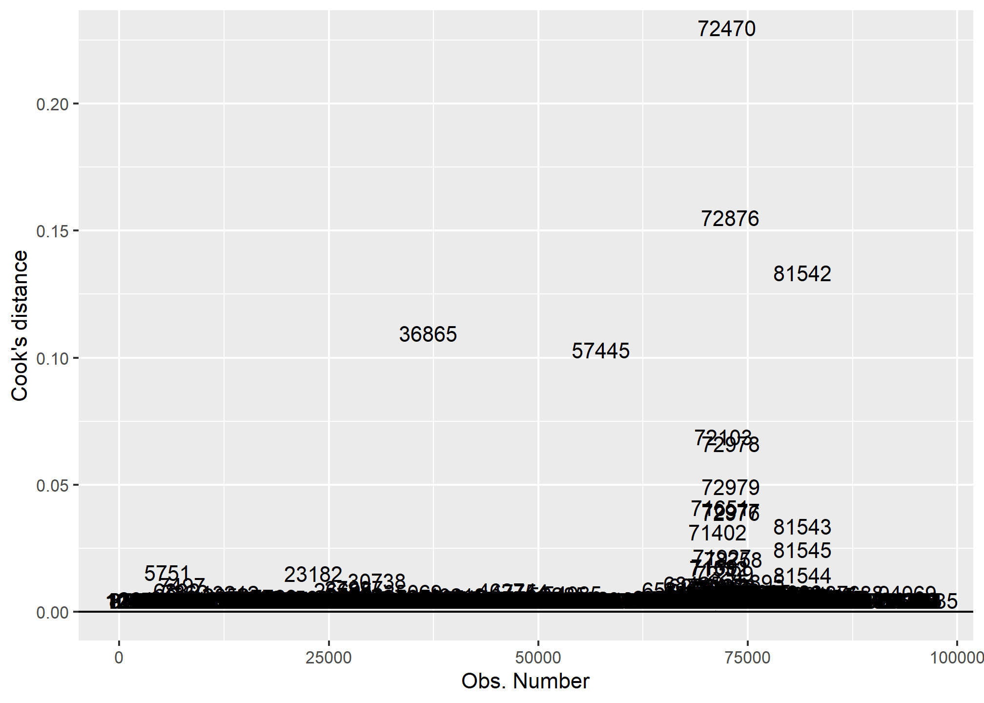 xlab("Obs. Number")+ylab("Cook's distance")+