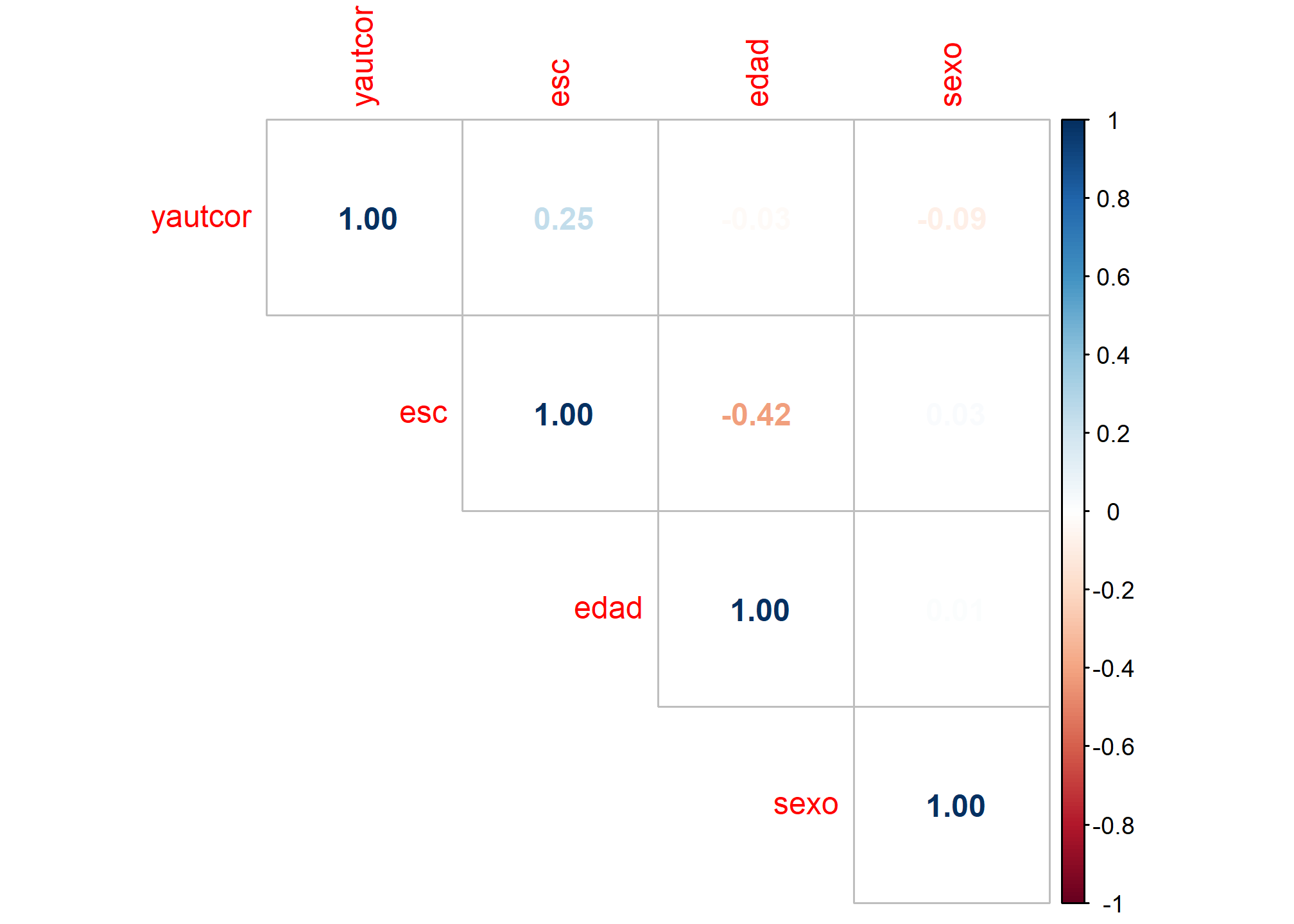 Realizamos un análisis de correlaciones bivariadas con el fin de revisar si existe una relación lineal entre la variable dependiente y las variables independientes, además de comprobar que no existan problemas de colinealidad entre estas últimas. Se calcula la matriz de correlaciones entre las variables yautcor, esc, edad y sexo utilizando la función cor(). La opción use=“complete.obs” se utiliza para omitir cualquier fila que contenga valores faltantes (NA). Luego, se asigna la matriz de correlaciones al objeto mc.