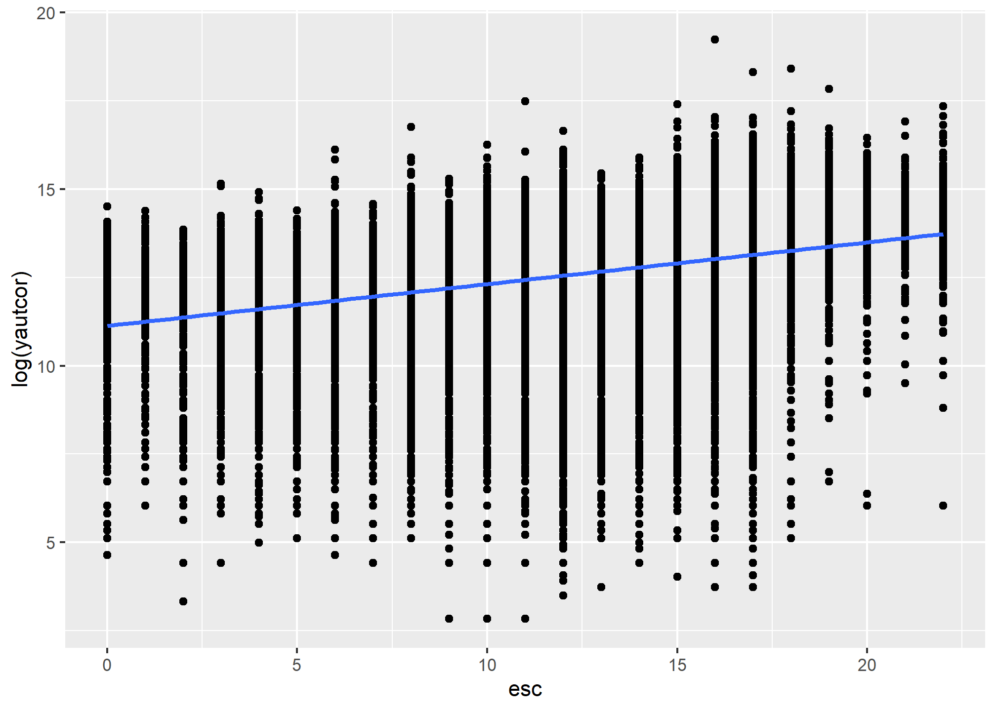 A continuación, usamos el paquete ggplot para obtener un gráfico que nos muestre la distribución del ingreso autónomo de acuerdo con la escolaridad. Dado que el ingreso tiene muchos casos extremos, aplicamos una transformación logarítmica log() para visualizar de mejor manera la relación entre las variables. Este gráfico nos permite observar la existencia de relación lineal entre las variables. Dicha visualización es relevante porque en algunos casos, dos variables pueden tener una baja correlación, pero estar relacionadas de manera no lineal, lo cual puede observarse mediante la visualización. El gráfico muestra que hay una relación lineal positiva entre yautcor y esc.